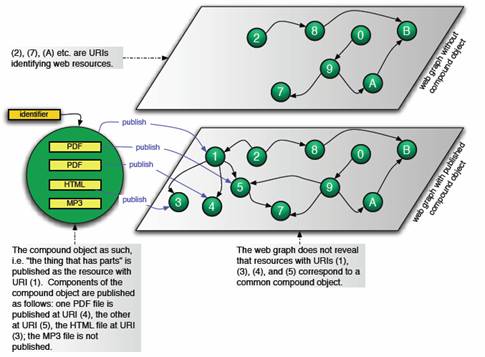The OAI-ORE mechanism for leveraging the web architecture to express the component/compound object relationship entails the following:
