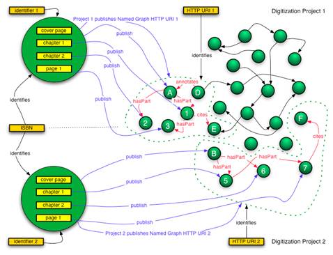 In both cases, the named graph is referenced by means of its HTTP URI. This URI is the handle for use and re-use of the named graph. However, Case 2 introduces a complication in that agents (humans and machines) can reference a specific scanned version of a book by means of the URI of the containment node. This ambiguous referencing could be addressed in a variety of ways, including:
