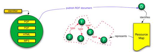 · Making available, via the HTTP URI that identifies the named graph, a distinguished representation, the Resource Map (ReM). The ReM is an encoded description (serialization) of the named graph. It can be regarded a “splash page” for machine consumption.